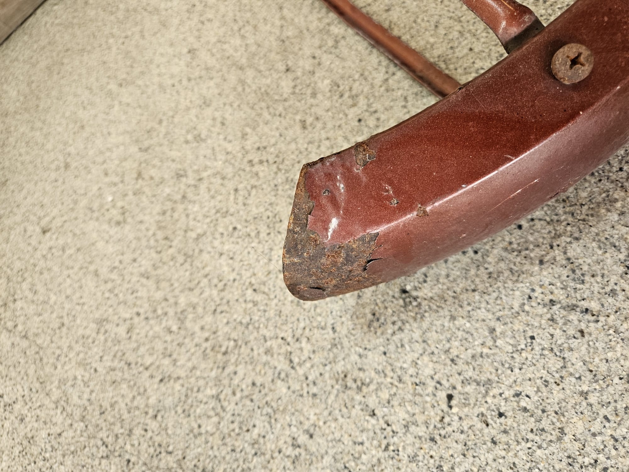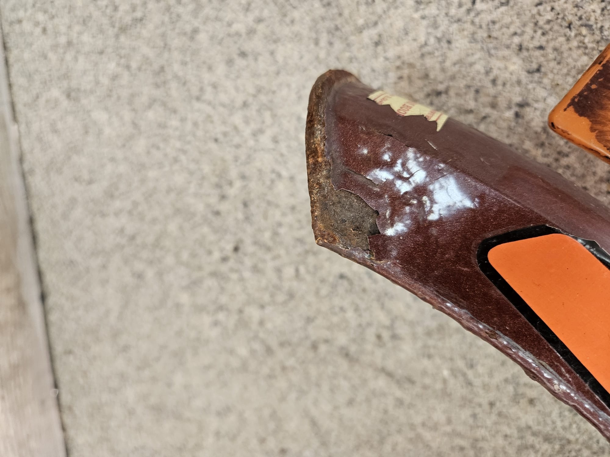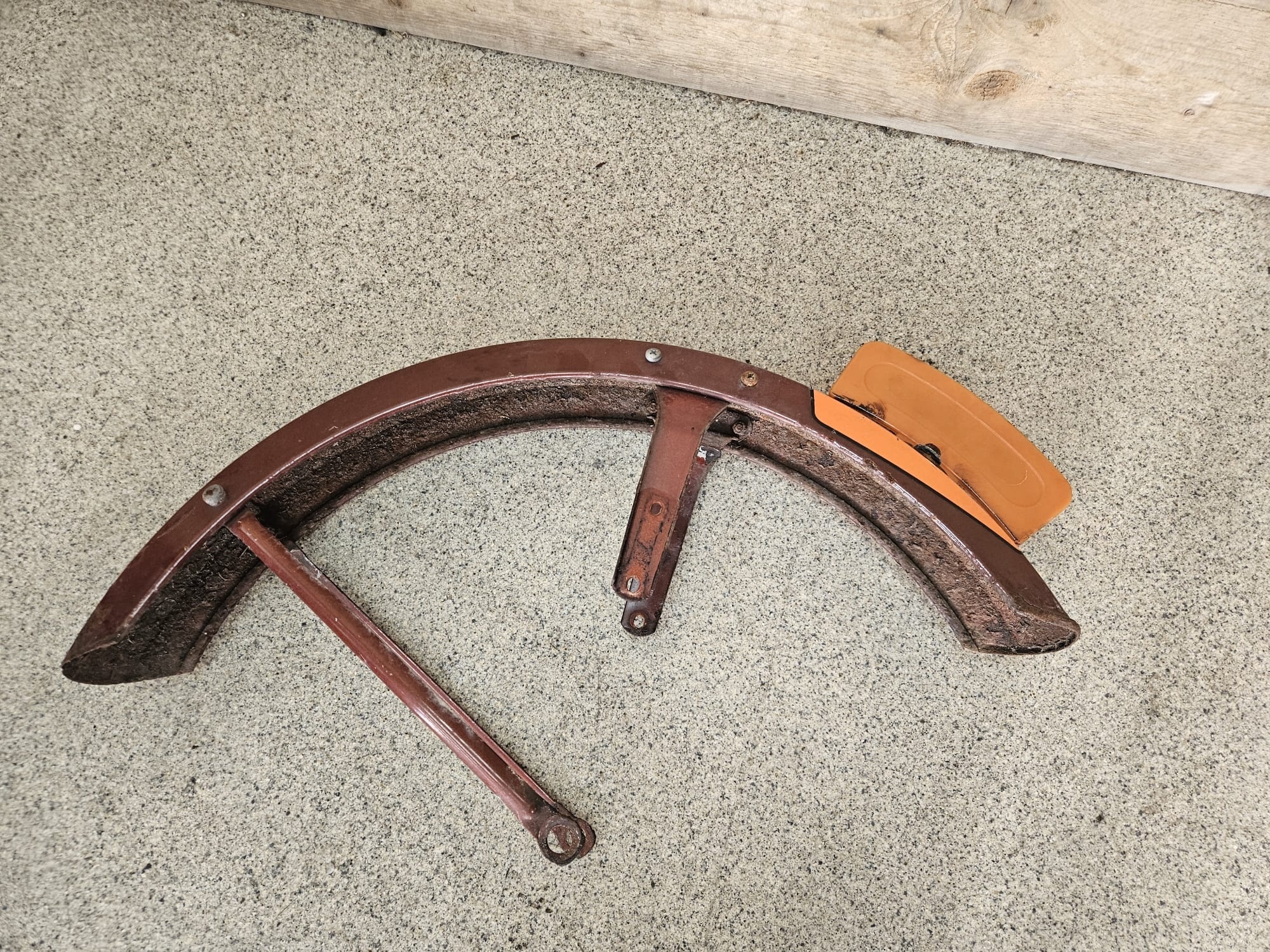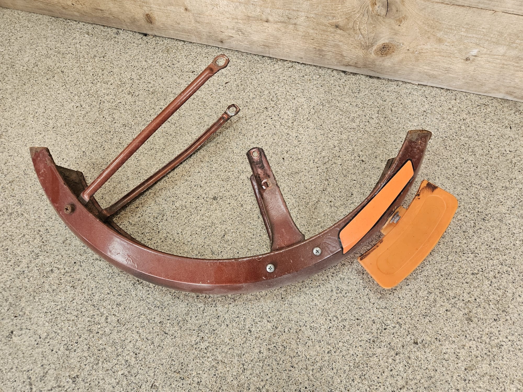 Voorspatbord voor A35. Roestig op meerdere plekken. Mogelijk nog wel goed om op te knappen. Bij dit spatbord zitten ook 2 platen om het spatbord aan de voorvork te monteren (oud type), de beugel en de oranje plaat.Specificaties