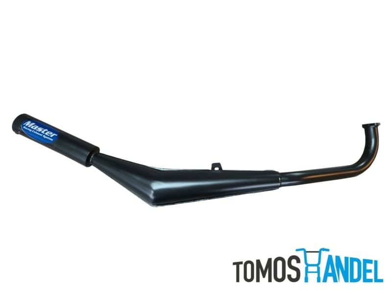 Master Racing uitlaat in het zwart uitgevoerd. De uitlaat kan verkleuring de bocht (zoals alle uitlaten). Hier zit geen garantie op. De pasvorm is (net als alle imitatie uitlaten) niet altijd even goed. Met een beetje passen en meten is het altijd wel mogelijk om hem passend te krijgen. De demper zit met één popnagel vast, het is verstandig om de demper eventueel extra goed vast te zetten met extra popnagels of bouten. Als de demper niet beter wordt vastgezet kan de demper lostrillen na een tijdje.Specificaties