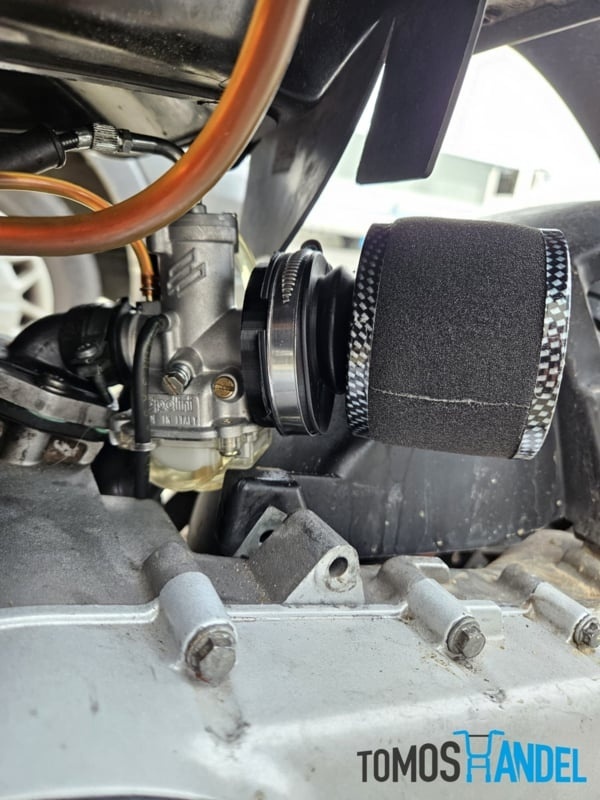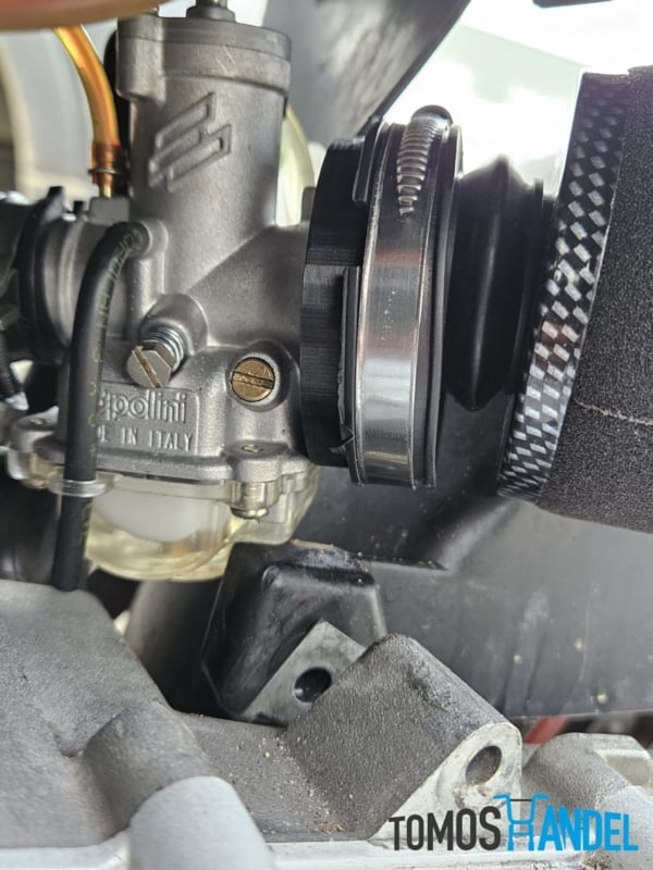 Adapter om een Tomos luchtfilter aan te sluiten op een Polini CP carburateur. Voor Polini CP 19 en Polini CP 21 carburateurs met een luchtfilter aansluiting van 60mm.Specificaties