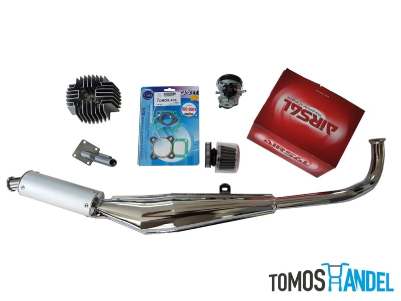 Opvoerkit voor een grote vermogenstoename. Wij raden u aan om het Polini membraan of het originele membraan te gebruiken. Het Airsal membraan is van matige kwaliteit. De kit bevat: 50cc Airsal cilinderkit (inclusief zuiger, pakkingen, pistonpen, membraan, pistonpenclipjes en zuigerveren). Powerfilter SHA 15-15 dellorto imi carburateur 15mm spruitstuk 50cc HD (hoge druk) cilinderkop 50cc koppakkingset Bullet uitlaat (of andere uitlaat naar keuze).Specificaties