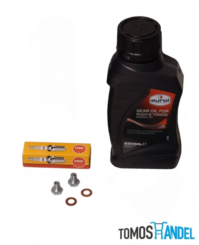 Onderhoud set voor Tomos A35. Voor klein onderhoud. - Eurol ATF blokolie. - Bougie (kies voor B6HS, B7HS of B8HS). - Aftapbouten met extra dikke kopere ringen (A-kwaliteit). Kies bougie B6HS bij snelheden tot ongeveer 40 km/h. Kies bougie B7HS voor snelheden tussen de 40 en 60 km/h. Kies B8HS voor snelheden tussen de 60 en 85 km/h.Specificaties