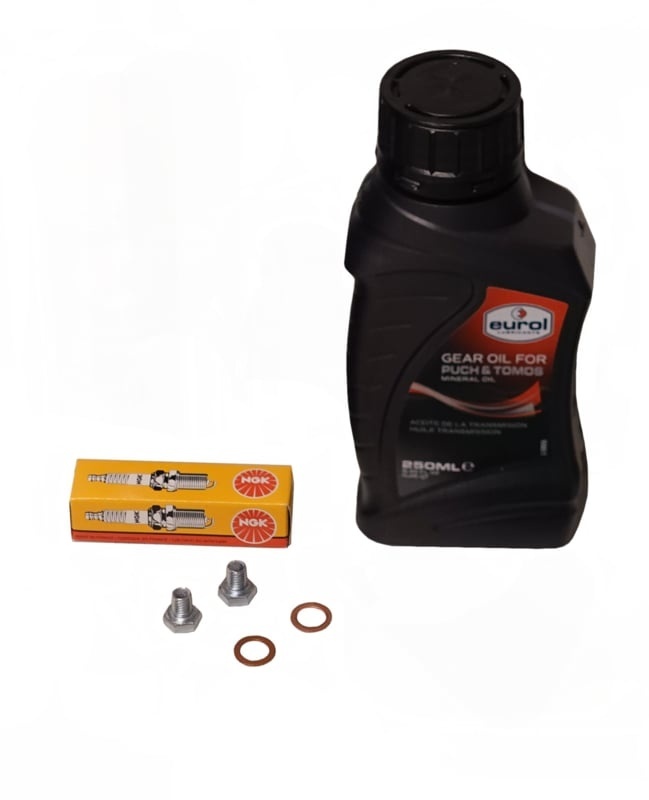 Kleine onderhoud set voor Tomos A35. - Eurol ATF blokolie. - Bougie (kies voor B6HS, B7HS of B8HS). - Aftapbouten met kopere ringen Kies bougie B6HS bij snelheden tot ongeveer 40 km/h. Kies bougie B7HS voor snelheden tussen de 40 en 60 km/h. Kies B8HS voor snelheden tussen de 60 en 85 km/h.Specificaties