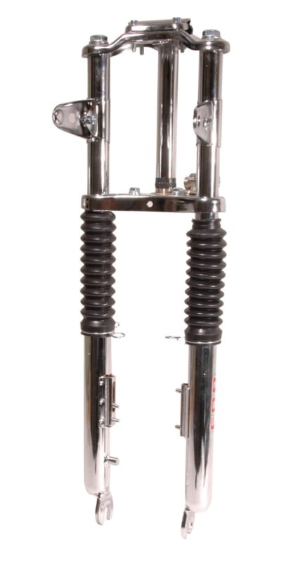 EBR voorvork voor Tomos A3 / A35. Chroom.Op het balhoofd van de voorvork zit een laklaag. Daardoor kan het lastig zijn om de binnenste lagerschaal te monteren. Verwijder de laklaag zo veel mogelijk met een mesje zodat hij makkelijker te monteren is.Specificaties